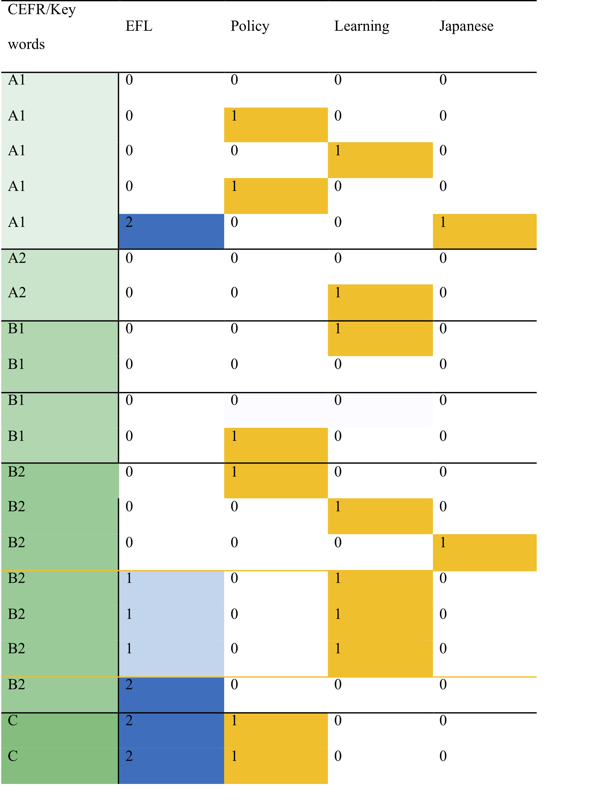 Table 5. Relationship between CEFR, ELF familiarity, and Q6 key words.