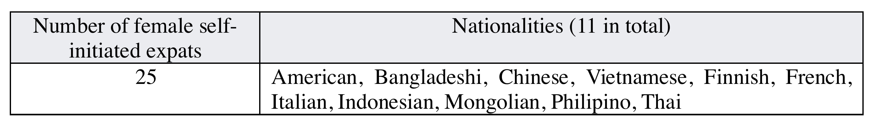 Interview data were collected from 25 female self-initiated expatriates who came from 11 different countries. Their demographic information is shown on the Tables 1 and 2. All are female and self-initiated expatriates; in other words, they chose to work in Japanese organisations within Japan. Some of them gained their education in Japan before working in their organisations (see Table 1). All of the interview data were collected by a research assistant of the author during 2023. Each interview took more than an hour, and they were conducted in English or Japanese.