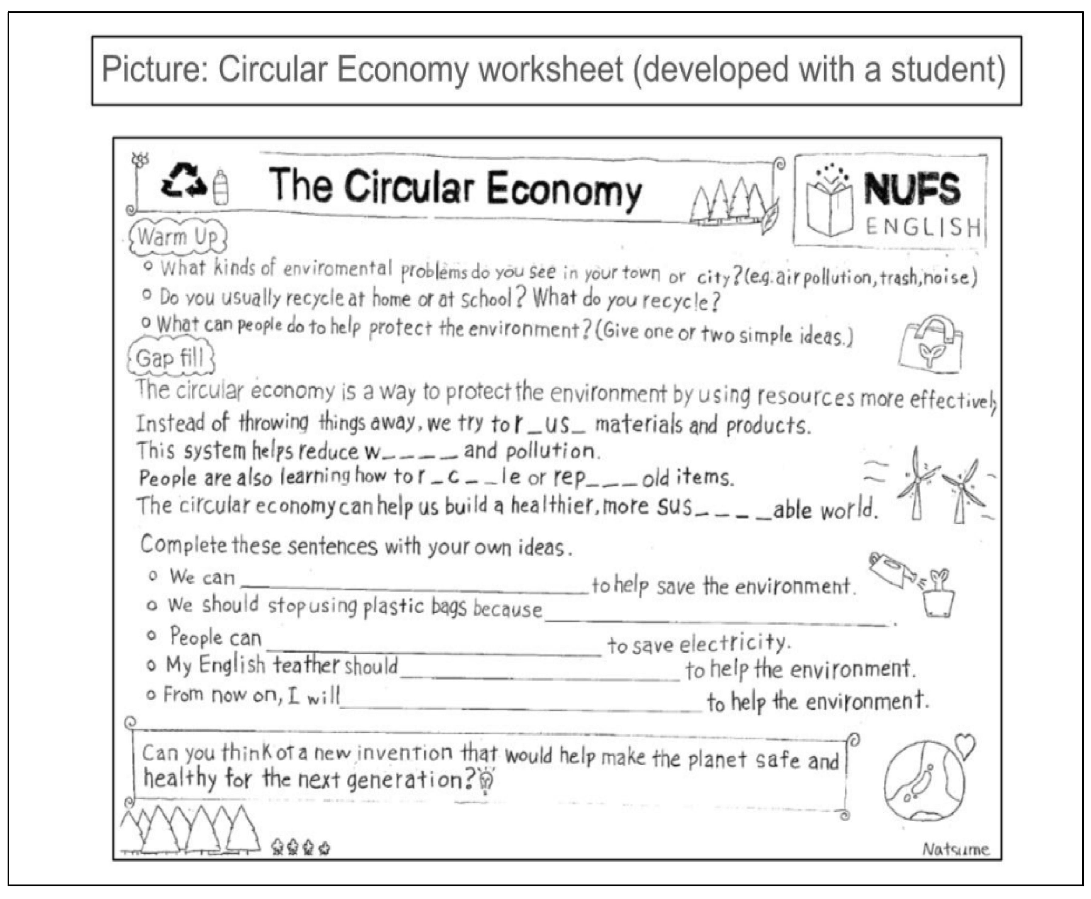 My next intervention was to design a worksheet on the topic of the circular economy. For this task, I enlisted the help of a student in one of my classes with artistic sensibilities. I created the content for the worksheet while she drew the worksheet using pencil and pen. The reason for avoiding using a computer was to give the worksheet an organic, “earthy” design. The lesson was tried out with two students at a local language school at the intermediate level (CEFR B1-B2) and two classes of communication students at a university at the upper beginner level (CEFR A2). Both groups of students seem to benefit from the worksheet and appreciate the environmental themes. Though the upper beginner-level students found the worksheet difficult, they appeared to enjoy the challenge.