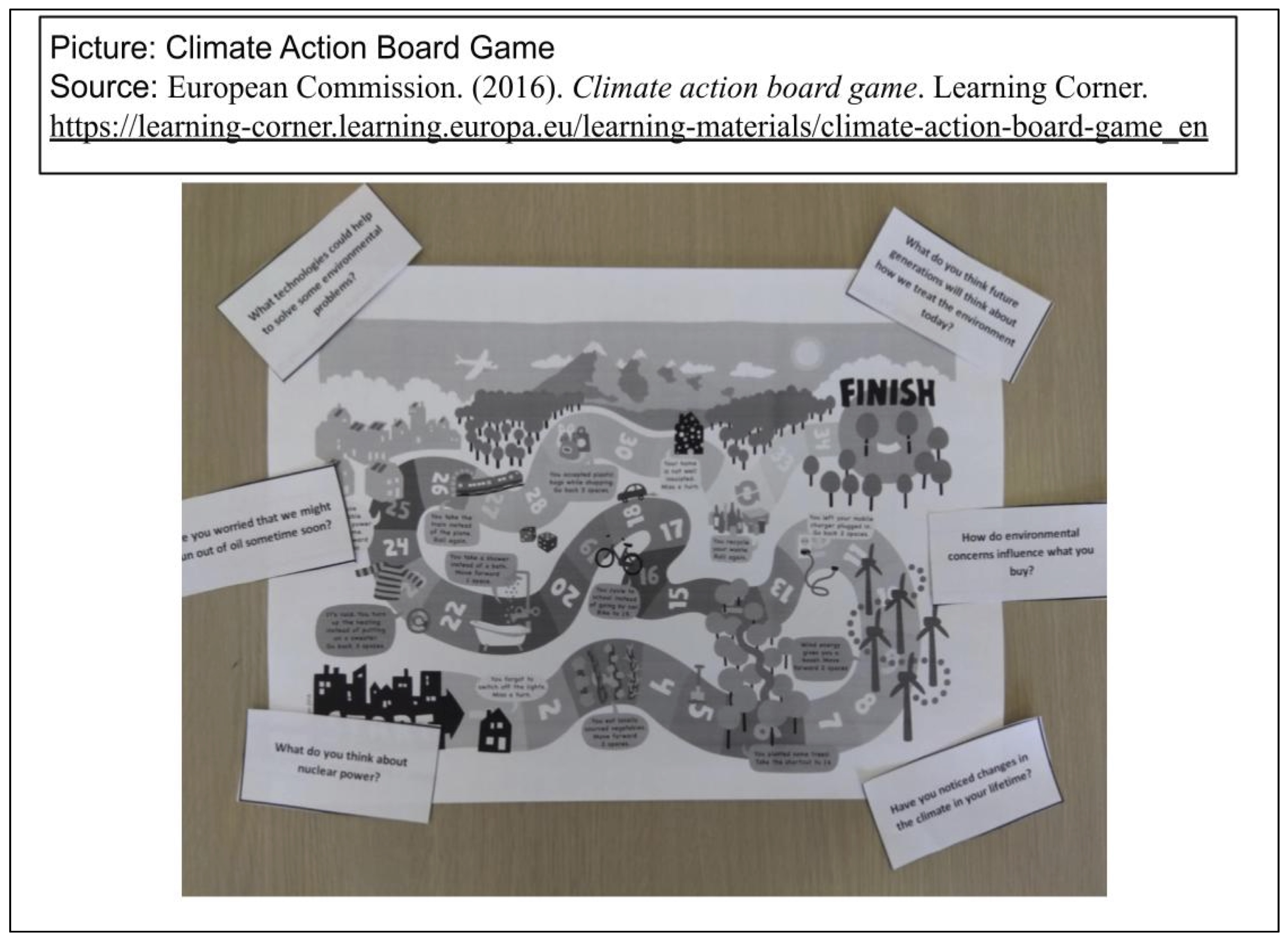 The use of games for educational and especially language learning is well represented in the academic literature (see Brooks, 2023; Lee & Hammer, 2011; Plass, Homer, & Kinzer, 2015). The specific inspiration for the use of game-based learning for this intervention came from a game developed by Whalen et al. (2018). The game encourages players to find environmentally sustainable ways to produce various products. However, because the game was developed with engineering students in mind, I decided to develop a simpler game that would take less time and could be used with learners at the upper-beginner to upper-intermediate level (CEFR A2 - B2). For this reason, I chose a game board developed by the European Commission (2016) to play with students. This resource was supplemented with environmentally themed question cards that were developed with students.