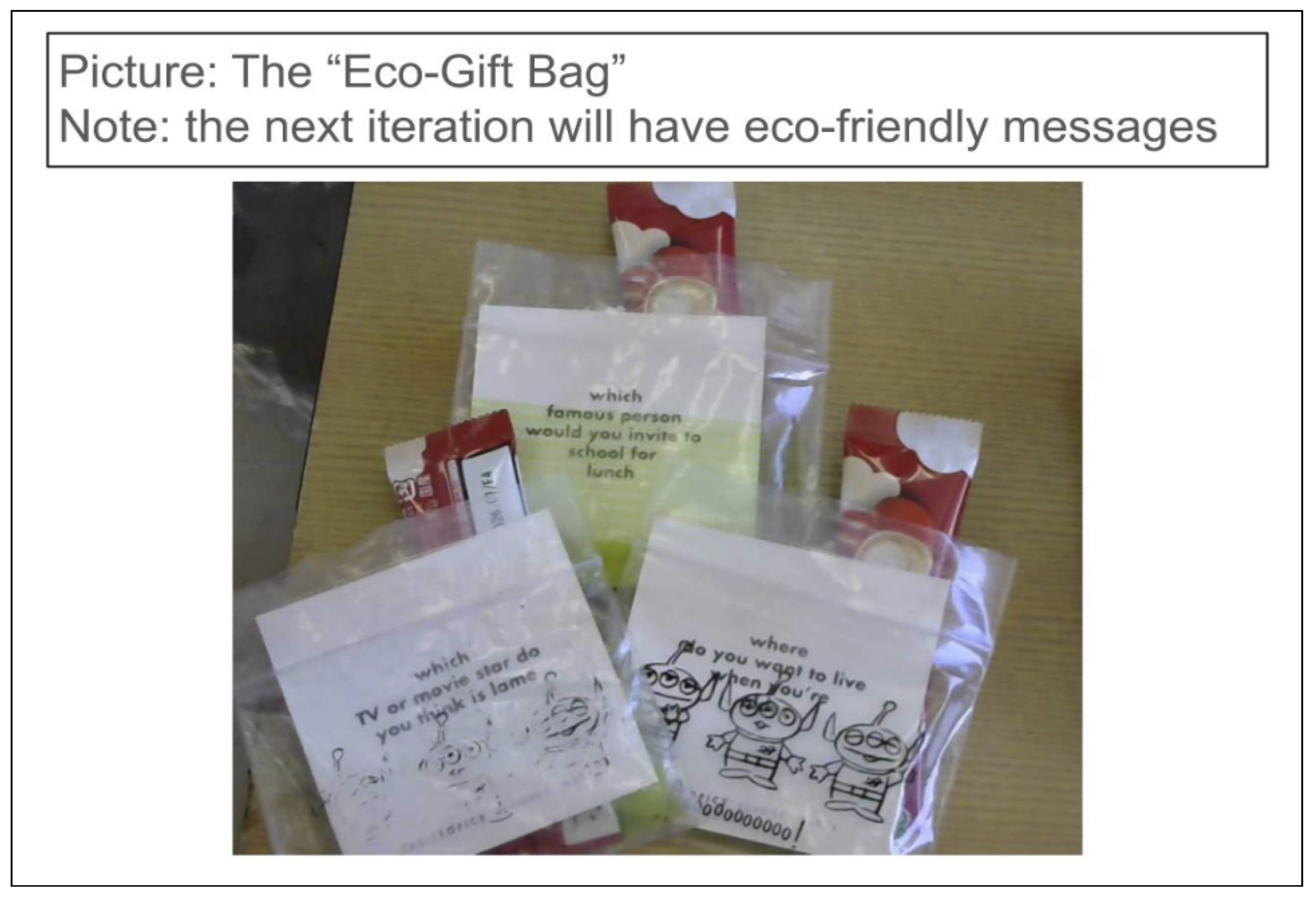 While cleaning my office and sorting through old materials, I thought of a new way to repurpose items I no longer needed. I gathered some old gift ziplock bags, some candies and latte pouches from a past event, and a stack of conversational topic cards that I had been using with students. From these various materials, the “Eco-Gift Bag” was born. The initial version of this idea involved giving the bags filled with the old materials to students as a reward for their hard work. However, I soon realised that I could write eco-friendly messages and environmental tips on little cards and include them in the bags as well. This activity encouraged me to be mindful of ways I could repurpose and use old materials rather than let them linger in my office or become waste.
