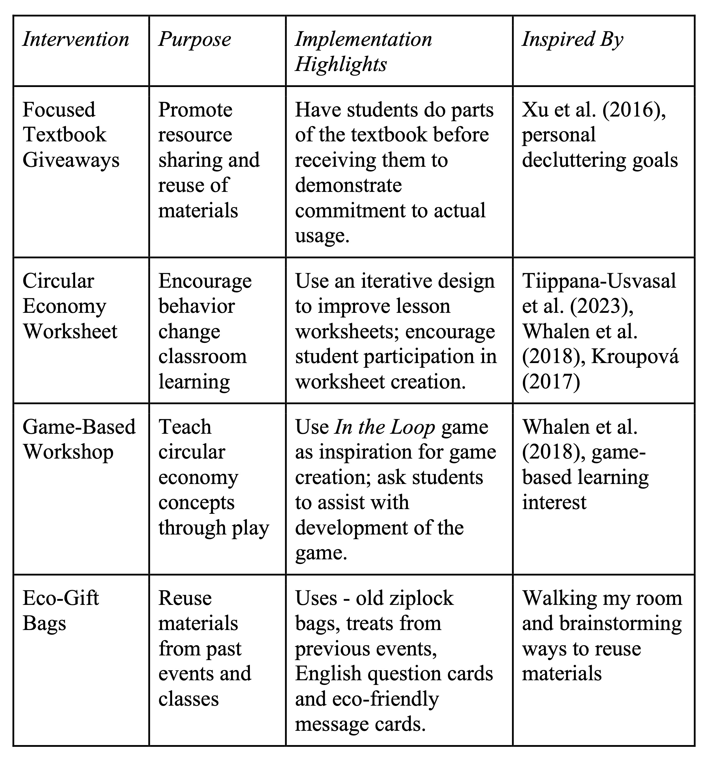 My search led me to several interesting studies that explored the intersections of education and waste management. A study by Tiippana-Usvasal et al. (2023) makes the case for teaching aspects of the “circular economy” at all levels of education through a bottom-up approach. In particular, the article highlights Finland as an exemplary model for teacher-led, grassroots approaches to curriculum development. An article by Xu et al. (2016) that investigates textbook recycling and reusing on campus had many good ideas but was far too technical (and systematic) for what I was hoping to accomplish. I did not want so much to fix a systemic problem of waste—something that was beyond my role at the university; rather, I was hoping to generate some good ideas for decluttering and reusing old resources that I could share with colleagues.
