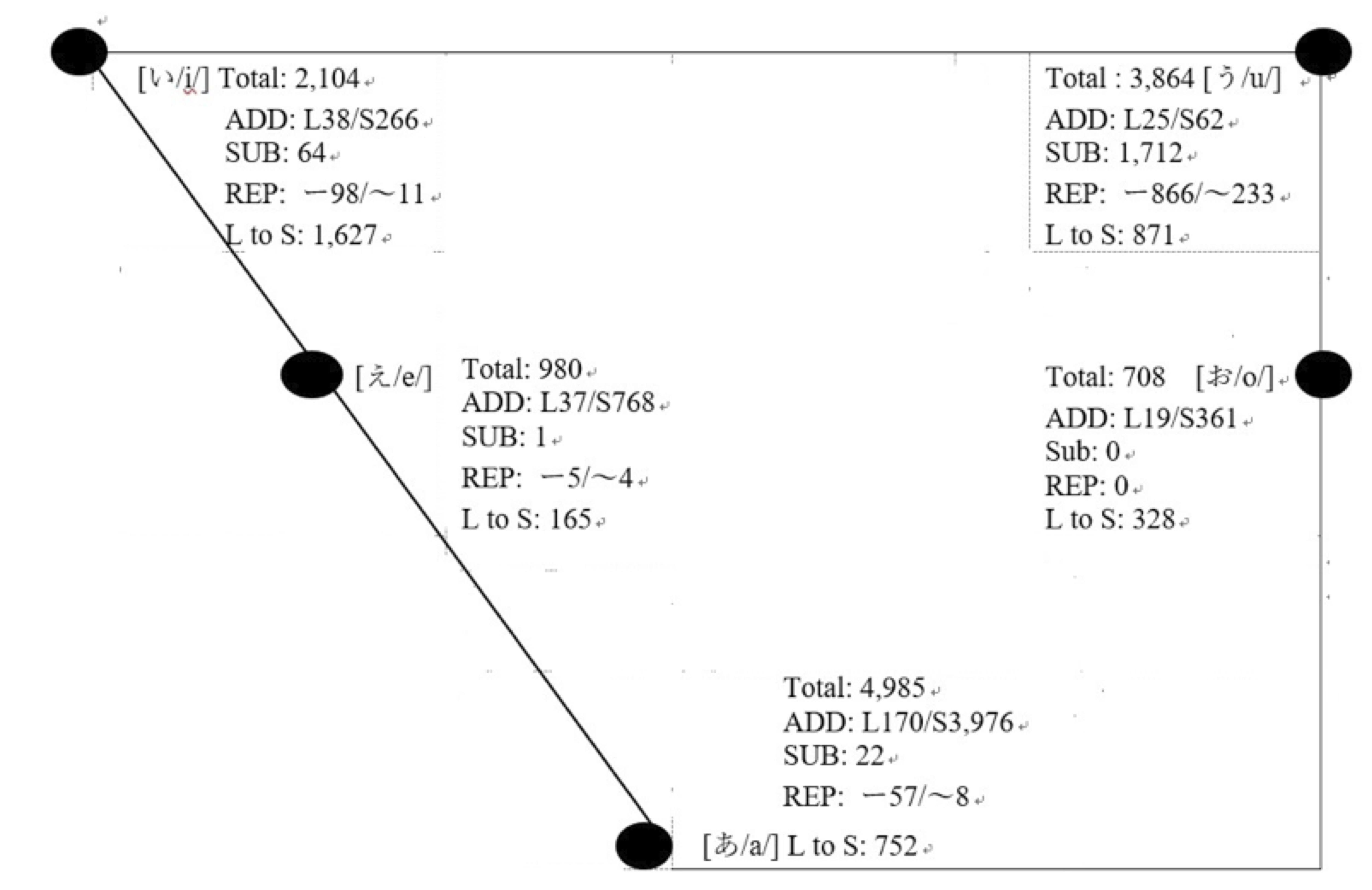 Firstly, /e/ and /o/ have a relatively small number of LP applied to them. Both of these are close-mid vowels (see Figure 2). Close-mid position is close to the central position (where the /ə/ sound is generated) and is relatively easy for pronunciation. Because of this, /e/ and /o/ are not heavily influenced by LP.
