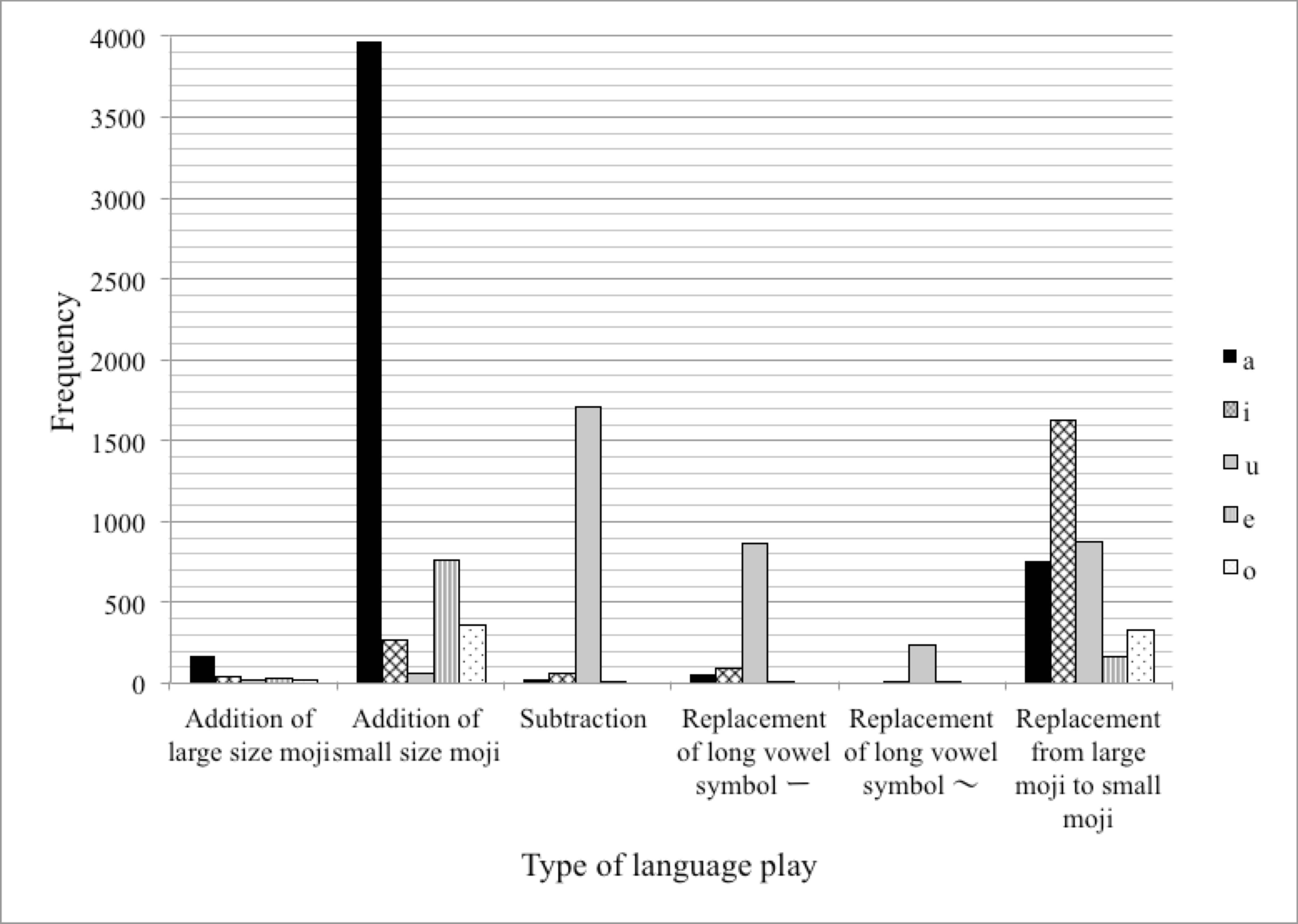 Language plays (LP), unorthodox usage of basic scripts to include some extra-textual effects, are often used in textualised oral communication, and these unique patterns have been gaining attention in the study of CMC including Japanese Keitai-mail. In addition, Japanese is a language which heavily relies on vowels (あ/a/、い/i/、う/u/、え/e/、お/o/; further details in the next section), and this will influence text and oral communication including violating uses of these features for interesting effects. Therefore, this study investigates quantitatively how vowels are utilised in Japanese Keitai-mail in order to analyse the extent to which people utilise their language system intentionally or unintentionally.