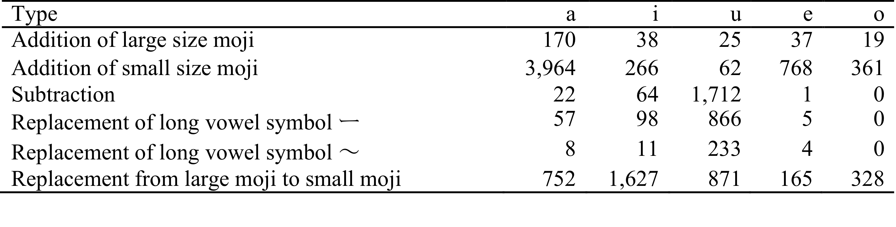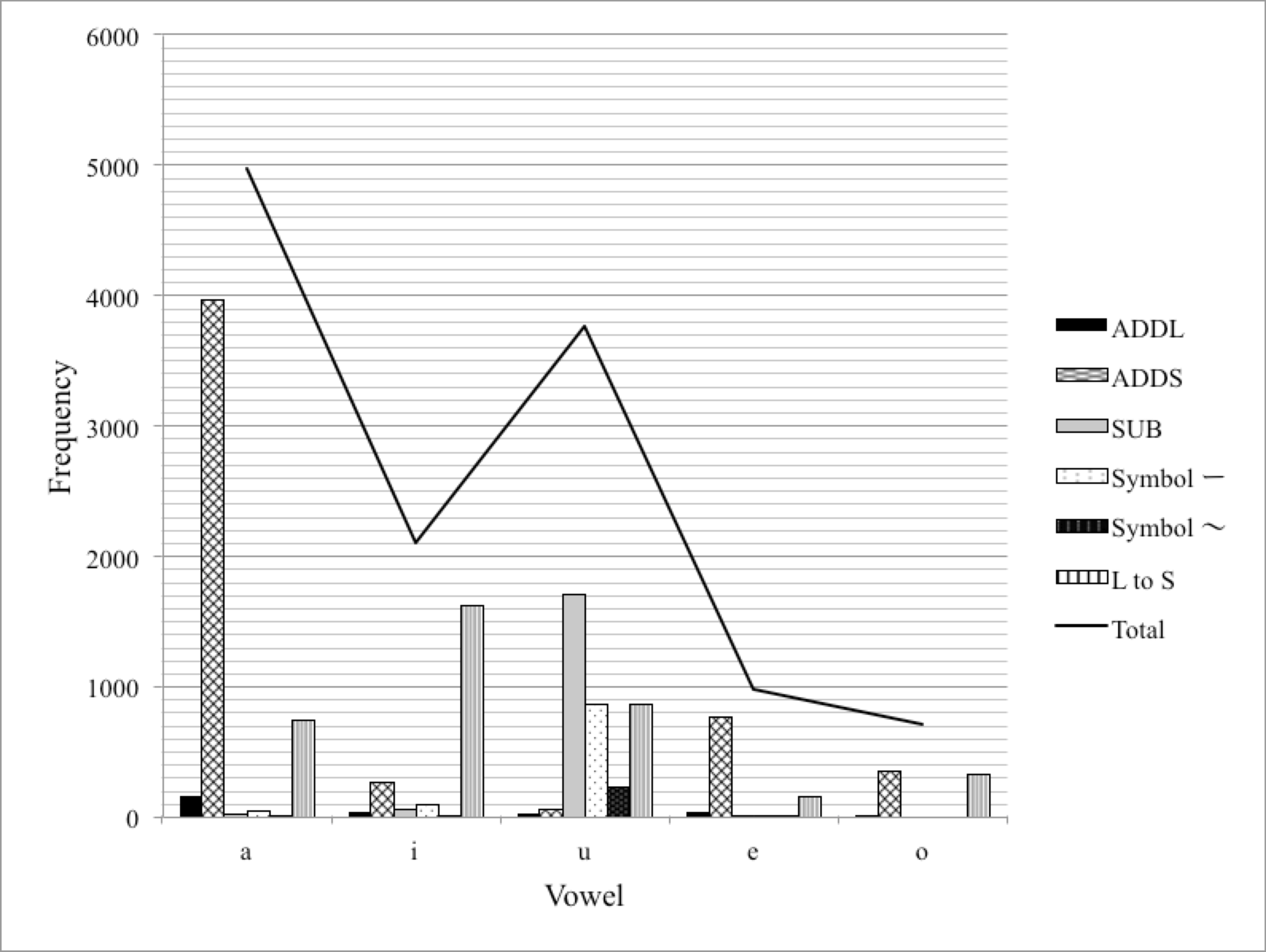 Looking at Figure 3, it is apparent that each form of LP tends to affect a certain vowel most. For instance, small moji addition occurs heavily with /a/, whereas subtraction can mostly be seen with /u/. Figure 4 depicts LP application for each vowel: the figure shows this tendency to apply a particular form of LP more clearly. In addition, Figure 4 also shows that LP are largely applied to /a/ and /u/, while on the other hand, /e/ and /o/ exhibit relatively small application of LP. As seen in Figure 2, LP application relates to the manner of articulation to a certain extent.