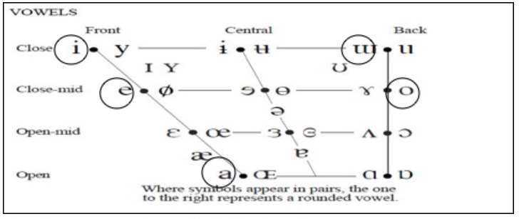 Figure 1. IPA chart for vowels (The International Phonetic Association, 2005) Note. Japanese vowels are circled by the author.
