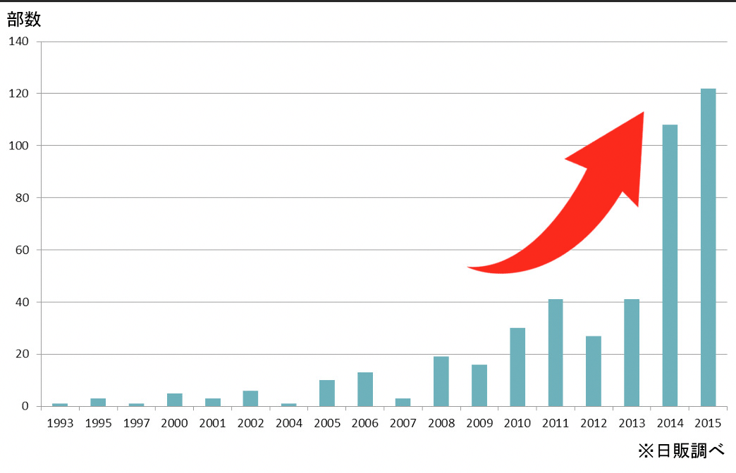 Figure 4: Number of yearly publications of Practical Manga books under the title Manga de Wakaru (Understanding with Manga) (HONNOHIKIDASHI 2017)