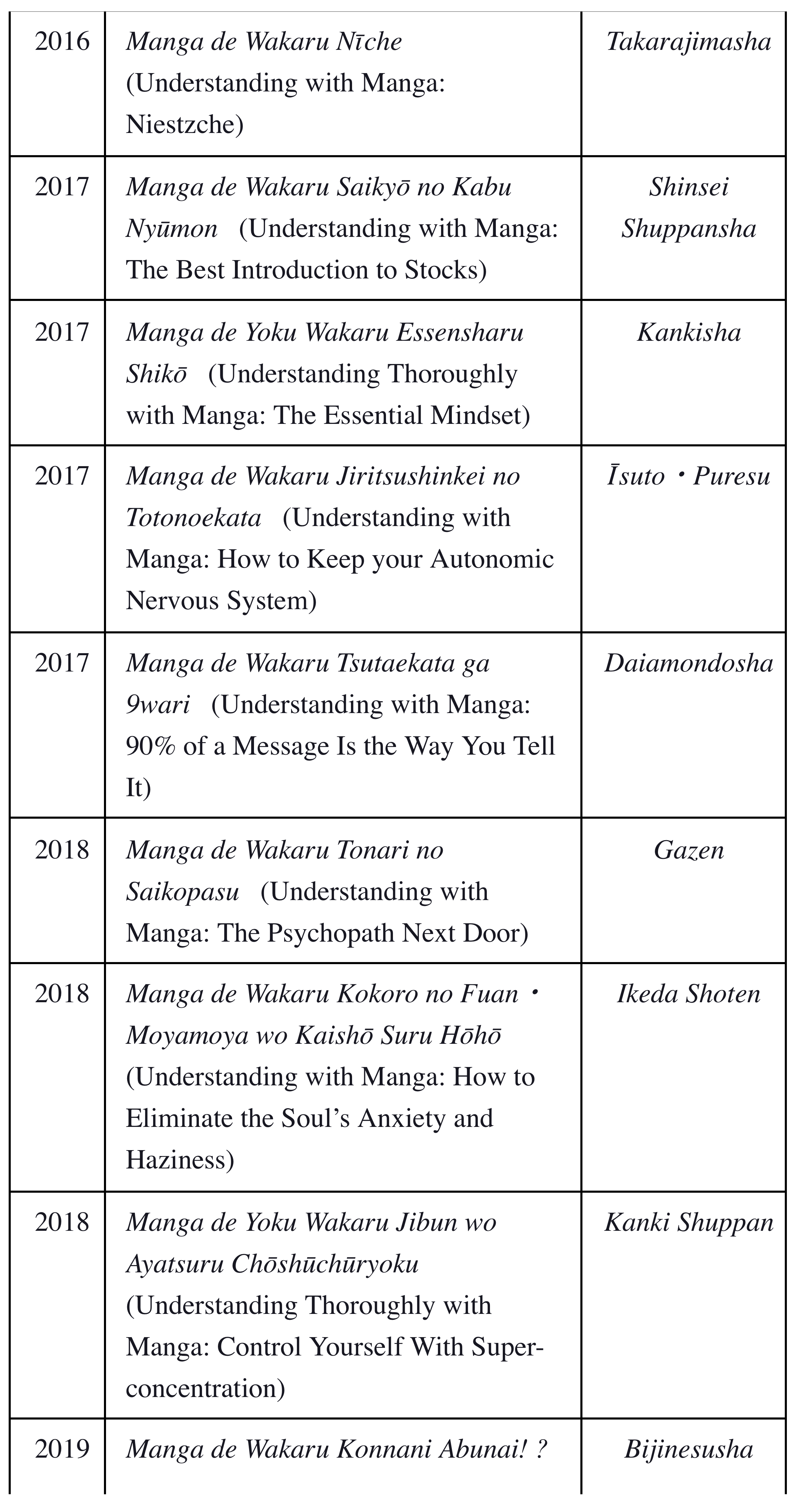 Entering 2010, alongside a rise in the number of Practical Manga publications (Figure 4), we can also see a boom in sales with titles such as Manga de Wakaru Nanatsu no Shūkan (Understanding with Manga: The Seven Habits) (Takarajimasha, 2013) and Manga de Wakaru Nīche (Understanding with Manga: Nietzsche) (Takarajimasha, 2016) hitting million sale marks (PRTIMES 2016), while others like Manga de Wakaru Shinryōnaika (Understanding Psychosomatic Medicine with Manga)(Yangu Kingu Kommikusu, 2010) selling out its first tankōbon editions in less than a month, even having the same content already available for free on its author’s official Website. (MANTANWEB 2017).