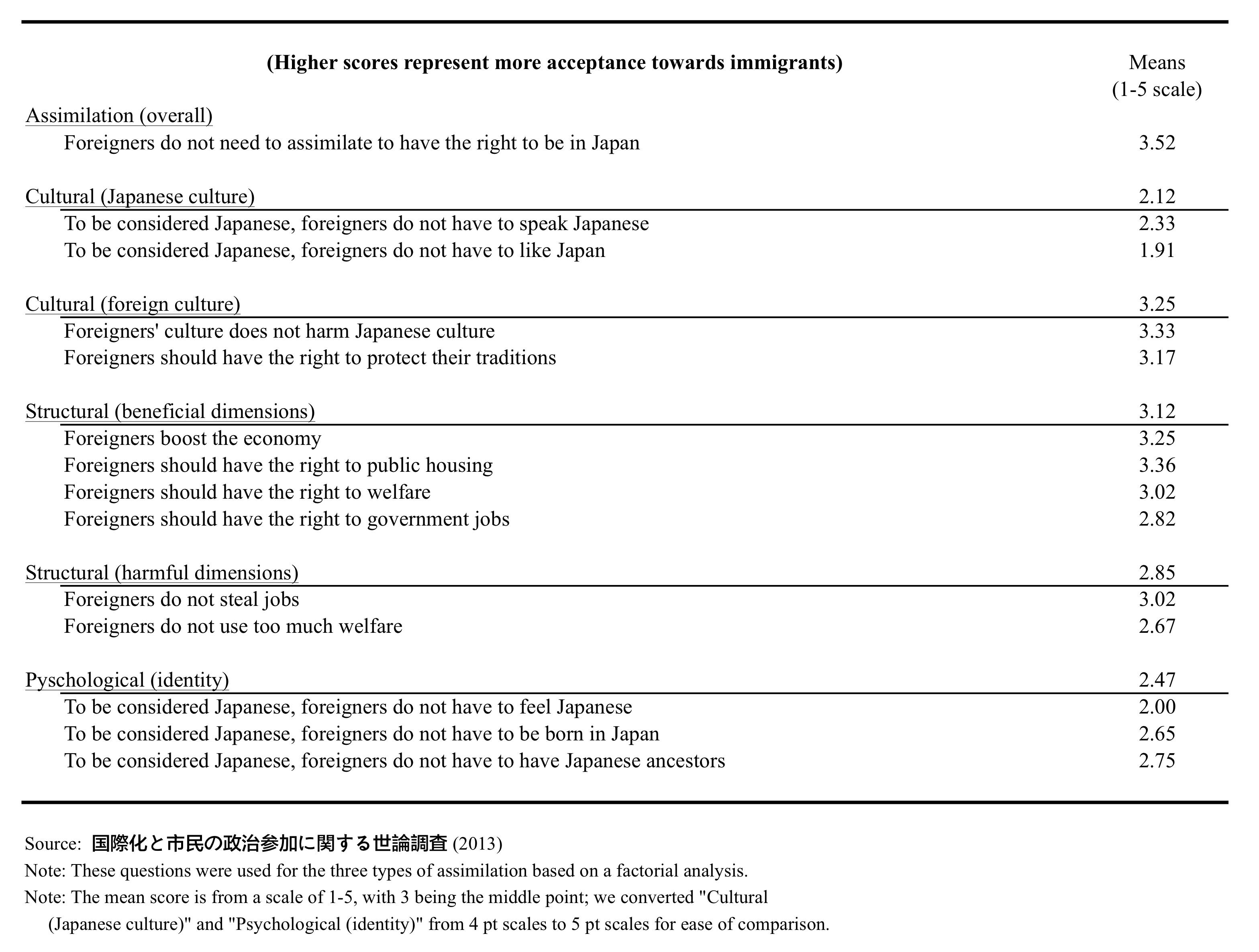 In response to the paucity of research into Japanese public opinion toward immigration (Kage et al. 2022), we have explored Japanese citizens' perceptions of immigrants living in Japan using a randomised national sampling of Japanese citizens from 2013. We were specifically interested in how they view the assimilation processes of foreigners residing in Japan. To accomplish this goal, we adopted a three-fold framework distinguishing cultural, structural, and psychological assimilation (Rumbaut 2015). Japanese citizens' attitudes toward immigrants' assimilation into Japanese society can be viewed as a proxy for the contexts of reception—in other words, to what degree immigrants will feel accepted.