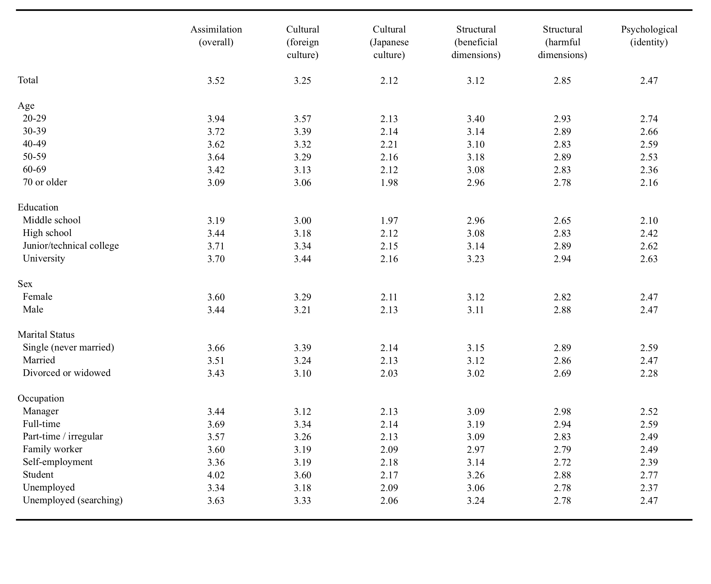 Most of the mean scores in Table 2 are near the middle (i.e., 3) and indicate a neutral receptivity toward immigrants. Overall assimilation is the highest at 3.5; three of the remaining five types of assimilation fall below 3. Perhaps it is easier to express acceptance of foreigners when the question is broader and more ambiguous. After all, what does assimilation mean? How do the Japanese think about assimilation (dōka)? We argue that examining the different types of assimilation offers a better gauge of anti- or pro-assimilationist beliefs. If the mean scores for these different assimilation types were all the same, we could assume that the distinctions between assimilation types are empirically meaningless. In Table 2, we see that this is not the case; the distinctions between the various assimilation types identified in this data are meaningful.