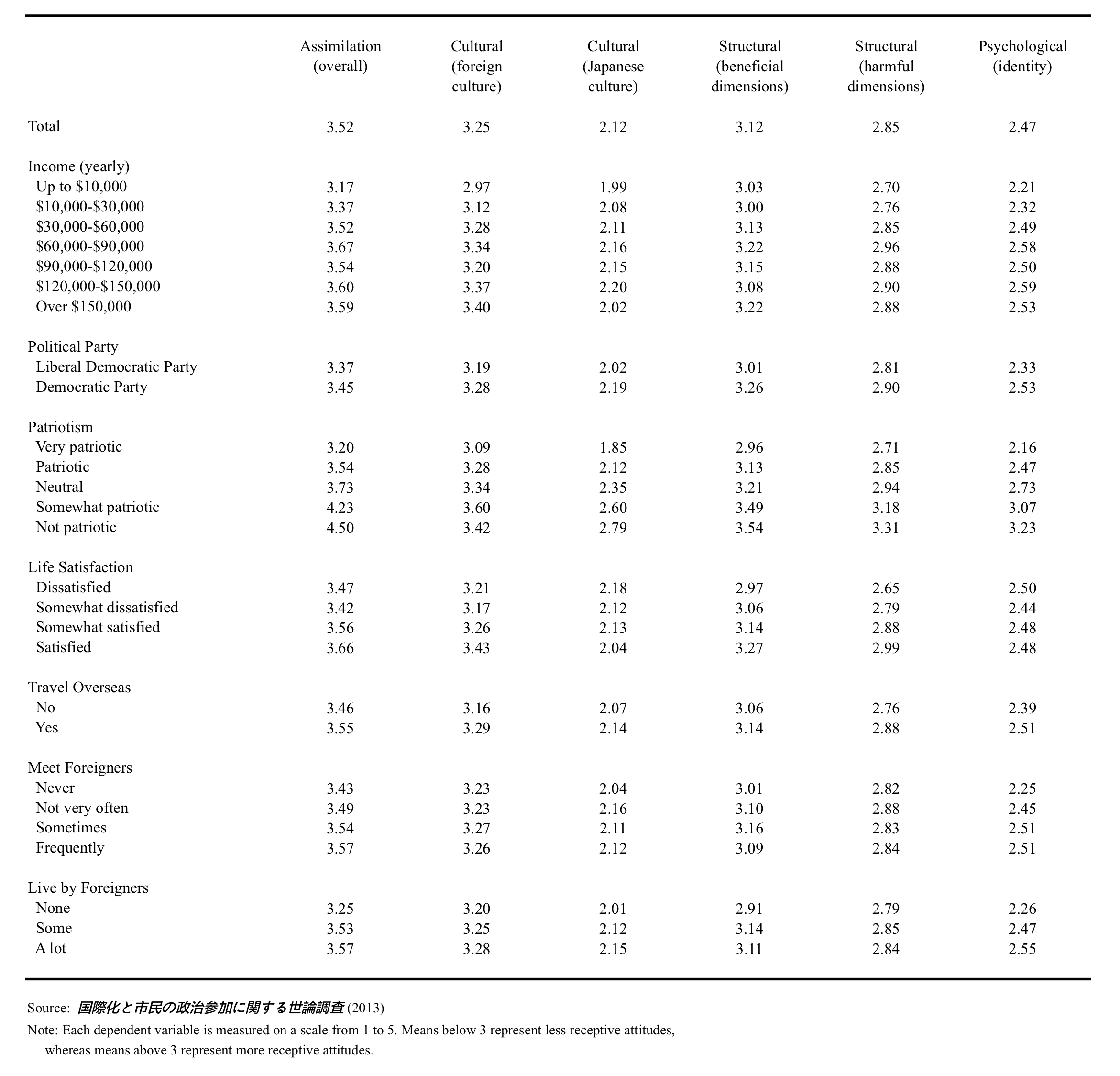 We acknowledge the existence of other indicators relating to cultural, structural, and psychological assimilation. We are nonetheless limited to the questions in this survey, which we believe is one of the first to ask Japanese citizens about their views on a wide range of cultural, structural, and psychological factors relating to foreigners. Thus, it offers us an opportunity to examine the contexts of reception by using a framework of assimilation. Also, given that this data was collected from a random sample of Japanese citizens, we can be confident that it accurately represents how they feel about foreigners concerning the questions asked.
