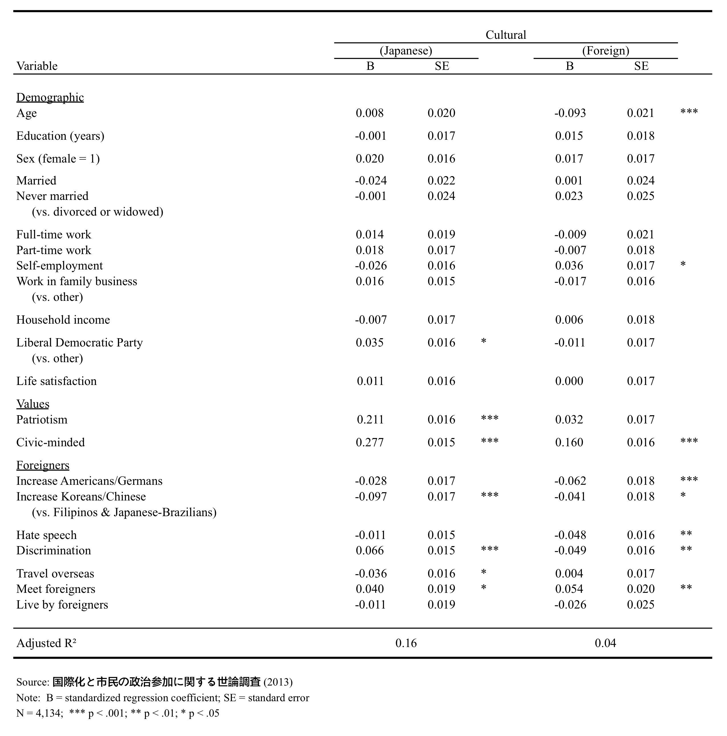 Second, note that the direction of influence—whether positive or negative—differs in 12 of the variables shown for both cultural models. Third, the impacts of the variables—most notably those that are significant—differ when comparing the standardised coefficients: civic-mindedness (0.277 vs. 0.160), the increase of Koreans and Chinese (-0.097 vs. -0.041), discrimination (0.066 vs. -0.049), and how often respondents meet foreigners (0.040 vs. 0.054).