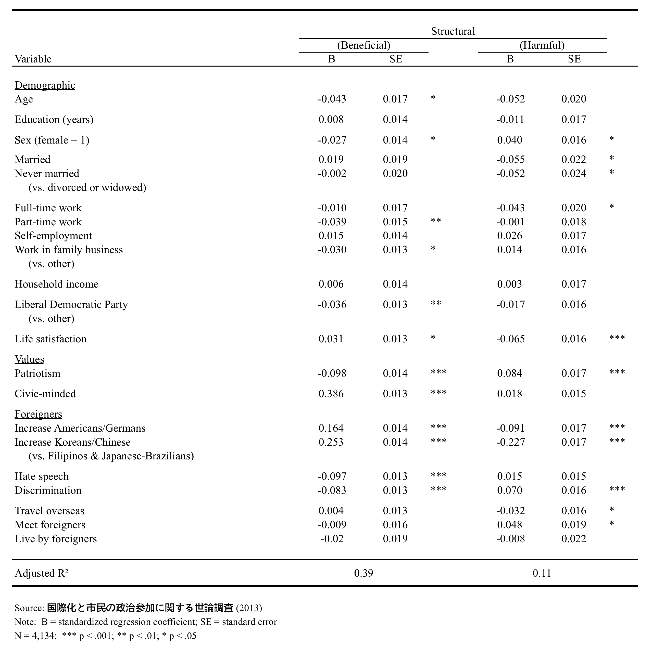 These conceptual differences were also borne out by the data. Among Japanese, the understanding of the beneficial and harmful aspects of structural assimilation also varies from person to person, as evidenced by our regression analysis of both types (see Table 5). Both dependent variables were driven in different directions by patriotism; increases in the number of Americans, Germans, Chinese and Koreans; discrimination; and life satisfaction. In other words, these variables were all significant, albeit in different directions—positive in one and negative in the other category of structural assimilation. Civic-mindedness had the most significant impact on beneficial cultural assimilation, whereas an increase in the number of Koreans and Chinese immigrants had the most notable effect on harmful cultural assimilation. Moreover, according to the adjusted R2, we can explain 39% of the beneficial aspect's variance and only 11% for the harmful aspect; each is important because citizens' opinions matter when trying to attract immigrants to work in Japan. The government sees immigrants as a solution to the shrinking and ageing population crisis; thus, they must convince citizens that immigrants are beneficial. In practical terms, the Government of Japan needs to show how encouraging working age immigrants can increase economic productivity, expand the tax base, and help provide for the social programs that the ageing population of Japan will increasingly depend upon.