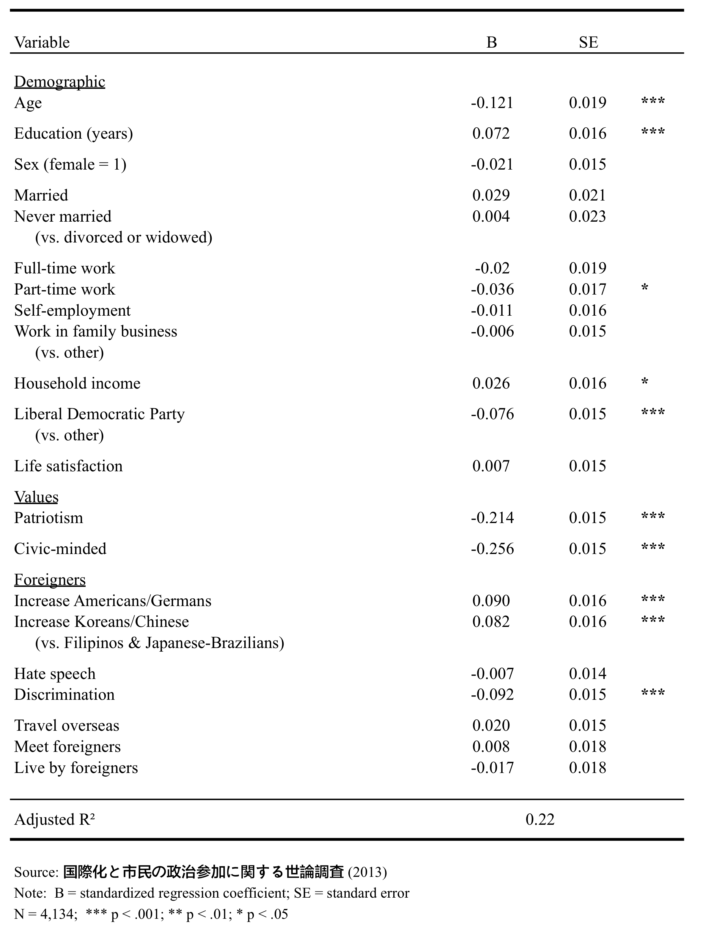 We grouped our independent variables into three analytic categories: (1) demographics; (2) values (i.e., patriotism, civic-mindedness, and life satisfaction); and (3) preferences and contact with foreigners. With the exception of civic-minded, all of the independent variables are the same variables used by all the authors of Tanabe’s (2013) book Japanese Perceptions of Foreigners. The variable groupings reflect the likely causal priority of demographic attributes in shaping their values, which are considered most likely to shape Japanese citizens’ views of foreigners through social interaction. Categories 2 and 3 are more proximate causal influences on acceptance.