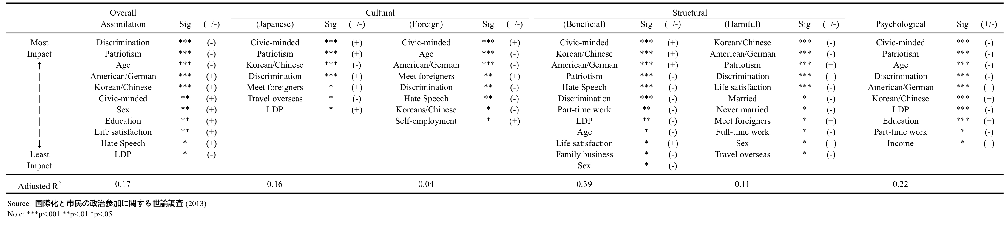 As shown in Table 7, there are numerous differences. First, the order of impact across the various types of assimilation differs drastically. Second, there are few variables where the direction of impact is the same; in most cases, the direction of impact fluctuates dramatically. Third, even when similar variables are significant, their levels of statistical significance differ. Finally, the levels of fit, as shown by the Adjusted R2, vary from 0.04 to 0.39. We acknowledge that most of this analysis is descriptive and exploratory; insofar as our variables address different types of assimilation, we can be confident in our findings given our randomised national sample of Japanese citizens. In any case, more studies are needed that examine how host societies view the assimilation of immigrants—especially regarding culture, structure, and identity.